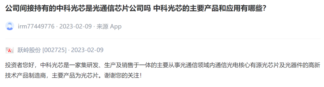 如果说跃岭股份炒的就是光通信、光芯片的话,那么之前就不应该出现持续的下跌才对,因为早在今年2月9日的时候公司就在互动平台表示,中科光芯主要从事光通信领域内通信光电核心有源光芯片及光器件,主要产品为光芯片。