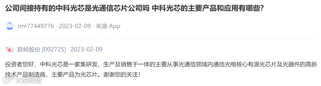 实际上,跃岭股份因间接持股从事光芯片的中科光芯而被炒作也是有一些刺激因素的。