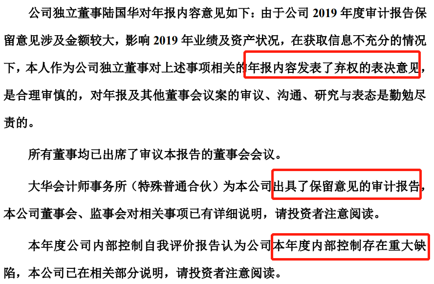 2019年联络互动的财报发布后震惊市场,因计提15.78亿商誉减值、经营业绩不及预期、大额诉讼导致的债务困境等原因,致使公司当年巨亏32.35亿,财务报告也被出具了保留意见的审计报告,一名独董直接对财报的表决弃权,公司也直言不讳的表示公司内部控制存在重大缺陷。