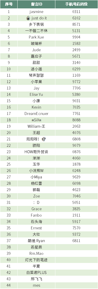 留言ID:若星辰、Rm.Mao、灯光下的笔迹、半夏、白菜君PLUS、邢飞飞、mes