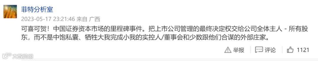 股东大会上所有的提案都被否掉,这放在整个A股历史上也是极为罕见的一幕,因此很多散户激动万分,表示这是中国资本市场的里程碑事件。