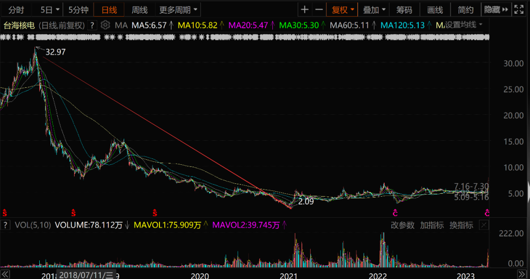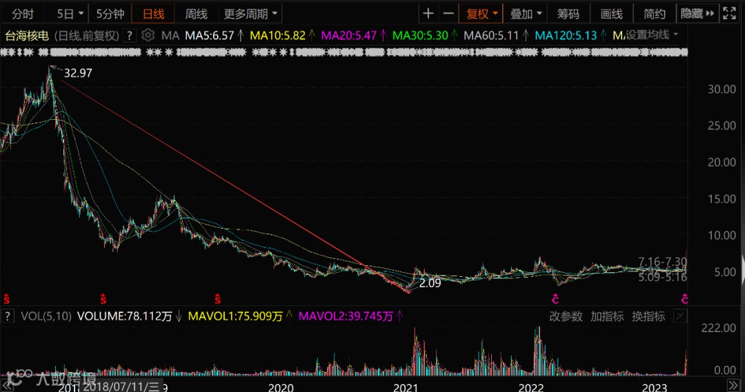2021年初,台海核电跌到了最低的2.09元,较2017年年末高点的32.97元,短短三年多跌幅高达近94%!