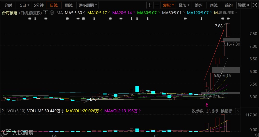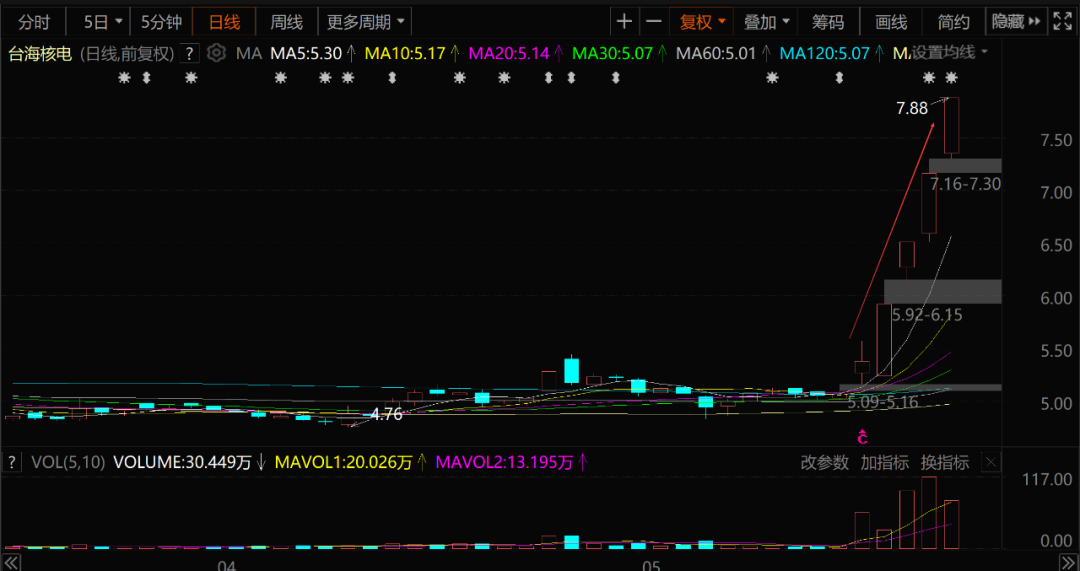 接来下,5月22日-25日这4个交易日,台海核电连续4天涨停。