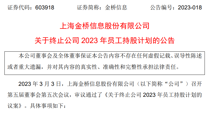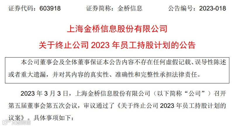 然而,反转来的太快。3月4日,金桥信息发布终止2023年员工持股计划公告,鉴于公司2023年员工持股计划相关事项和工作流程尚需长期且进一步的沟通准备,公司决定终止2023年员工持股计划。