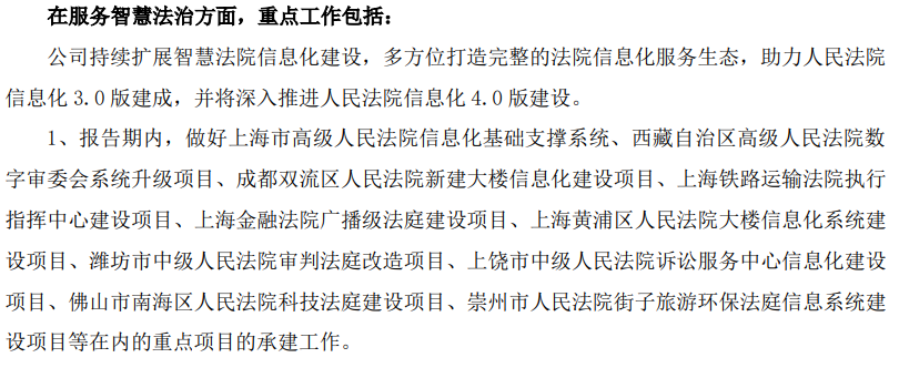 金桥信息的主营业务是提供各类多媒体信息系统行业应用解决方案及服务,主要产品包括SaaS、应急指挥系统、视讯软件等,2022年智慧场景解决方案营收6.02亿、占比69.65%,这项业务里面就包括智慧法治相关业务,具体为上海、西藏、成都等地法院提供信息化建设、改进等服务。