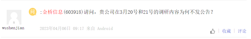 与此同时,因为金桥信息在互动平台的不积极行为,有投资者就在4月6日质疑“贵公司在3月20号和21号的调研内容为何不发公告?”