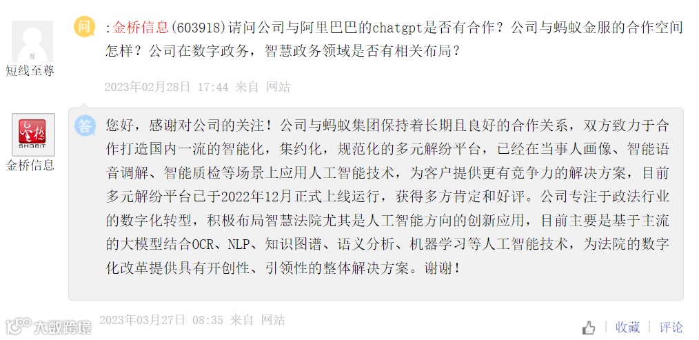 3月27日,金桥信息在互动平台明确表示,积极布局智慧法院尤其是人工智能方向的创新应用,目前主要是基于主流的大模型结合OCR、NLP、知识图谱、语义分析、机器学习等人工智能技术,为法院的数字化改革提供具有开创性、引领性的整体解决方案。