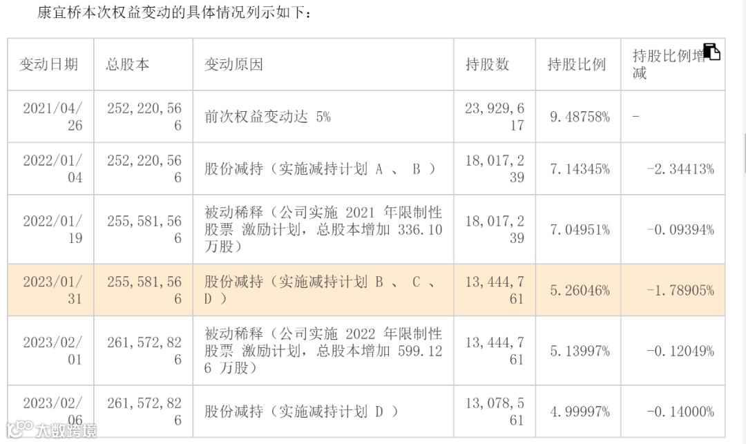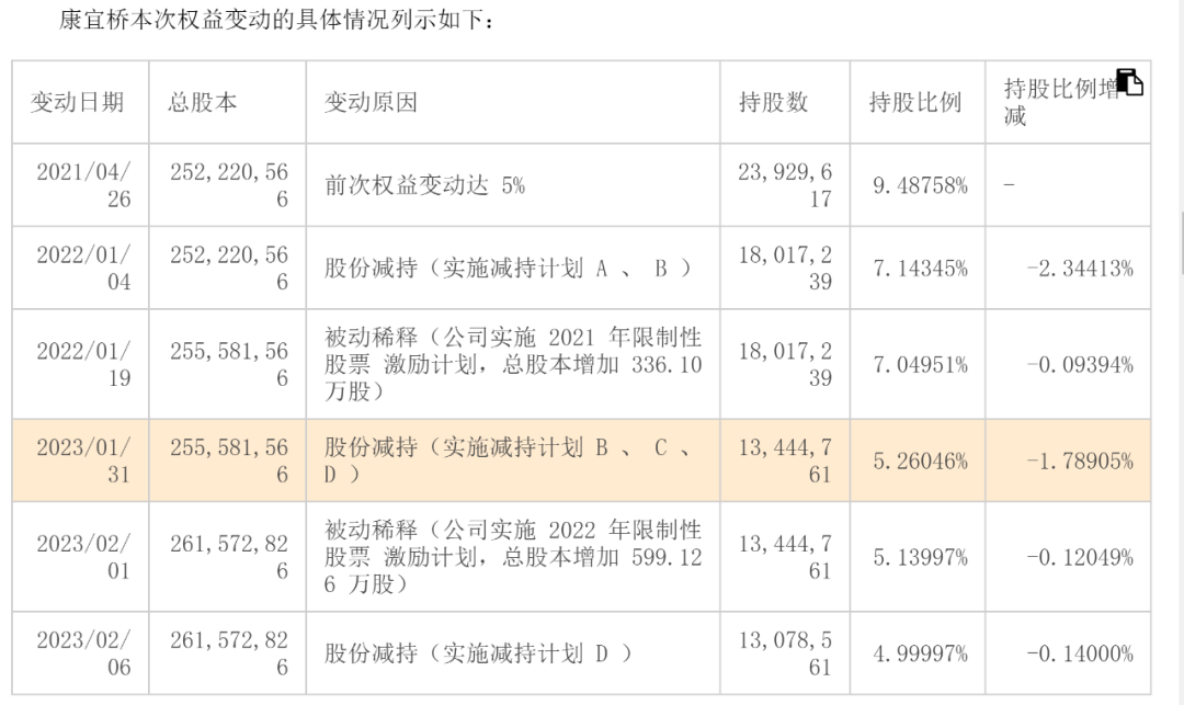 从下图可以看出,原本持股比例近9.5%的股东上海康宜桥投资咨询合伙企业(简称:康宜桥),在1月31日将持股比例减持了1.78%,此时持股比例还有5.26%,但是在2月1日和2月6日,康宜桥经过小幅减持后,持股比例变成了4.99997%。