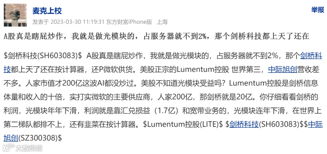 今天有投资者在股吧里面说,光模块也就占服务器的2%不到,并且质疑剑桥科技的利润成色,说其光模块年年下滑,利润靠汇兑损益和宽带业务。