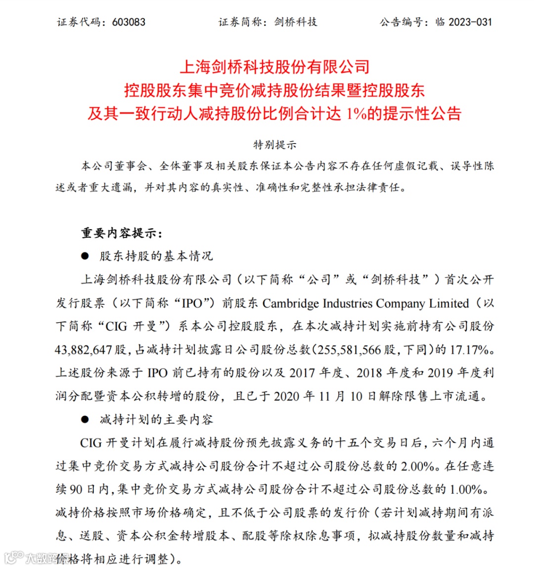 在康宜桥减持后,剑桥科技陆续发布减持公告。最近的是3月28日,发布了控股股东CIG开曼减持的公告。