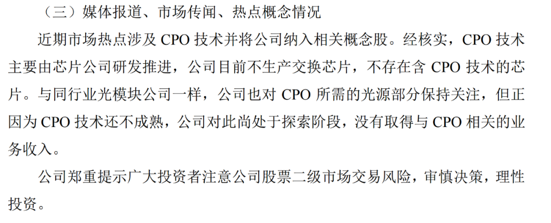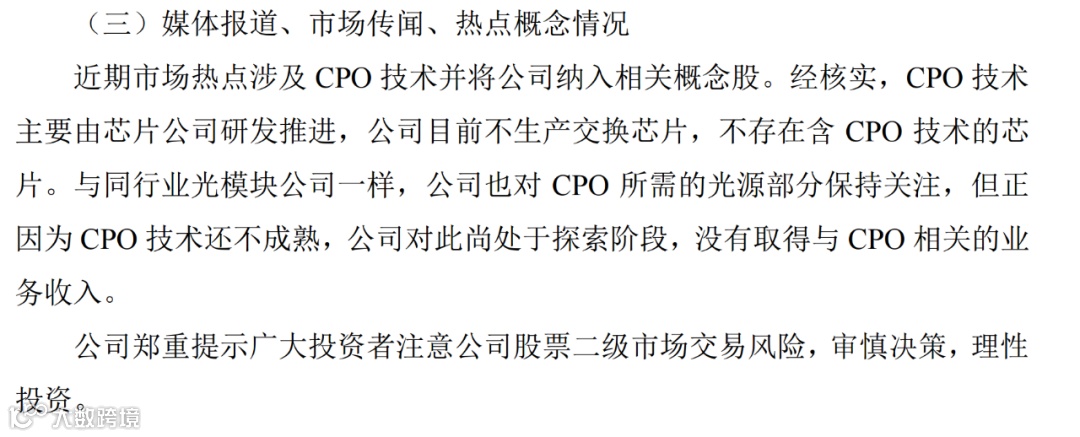 也是在3月28日这天,剑桥科技还发了份股票交易异常波动公告,明确表示“经核实,CPO技术主要由芯片公司研发推进,公司目前不生产交换芯片,不存在含CPO技术的芯片。与同行业光模块公司一样,公司也对CPO所需的光源部分保持关注,但正因为CPO技术还不成熟,公司对此尚处于探索阶段,没有取得与CPO相关的业务收入。”