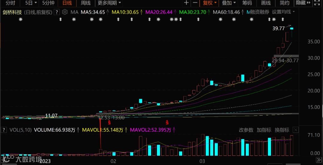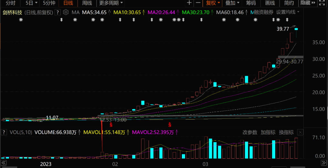 所以,剑桥科技的股价就又爆发了:3月24日、27日涨停,28日涨4%,29日再度涨停!
