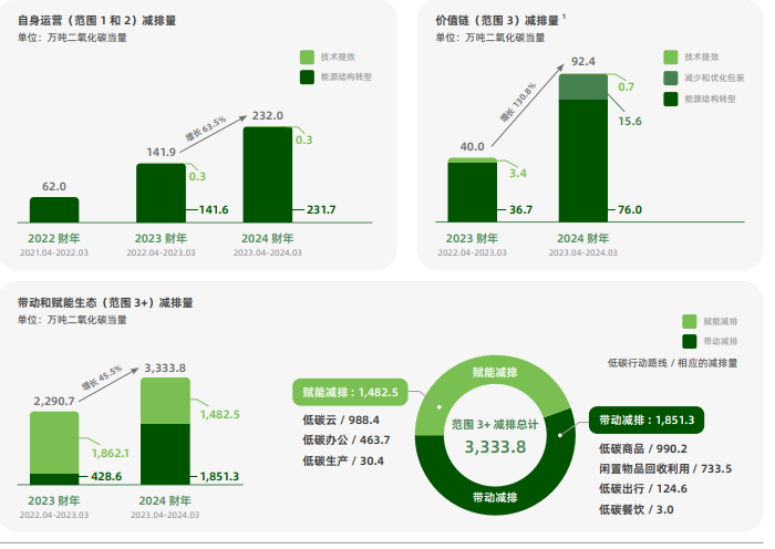报告中显示:在2024财年中,阿里巴巴不仅在自身运营方面取得了显著的环保成果,还推动了价值链的减排,成功实现了自身运营(范围1和2)和价值链(范围3)的温室气体净排放强度的双重降低目标。与前一年相比,公司自身运营的碳减排量大幅增长了63.5%,达到了232.0万吨。在价值链管理上,阿里巴巴同样表现出色,将净排放强度降低至每百万元营收8.1吨,同比下降7%。此外围绕“带动减排”与“赋能减排”两大策略,本财年阿里巴巴实现平台生态(范围3+)减排量3,333.8万吨,同比增长45.5%。这一系列数据彰显了阿里巴巴在推动可持续发展、应对气候变化方面的坚定承诺与积极行动。