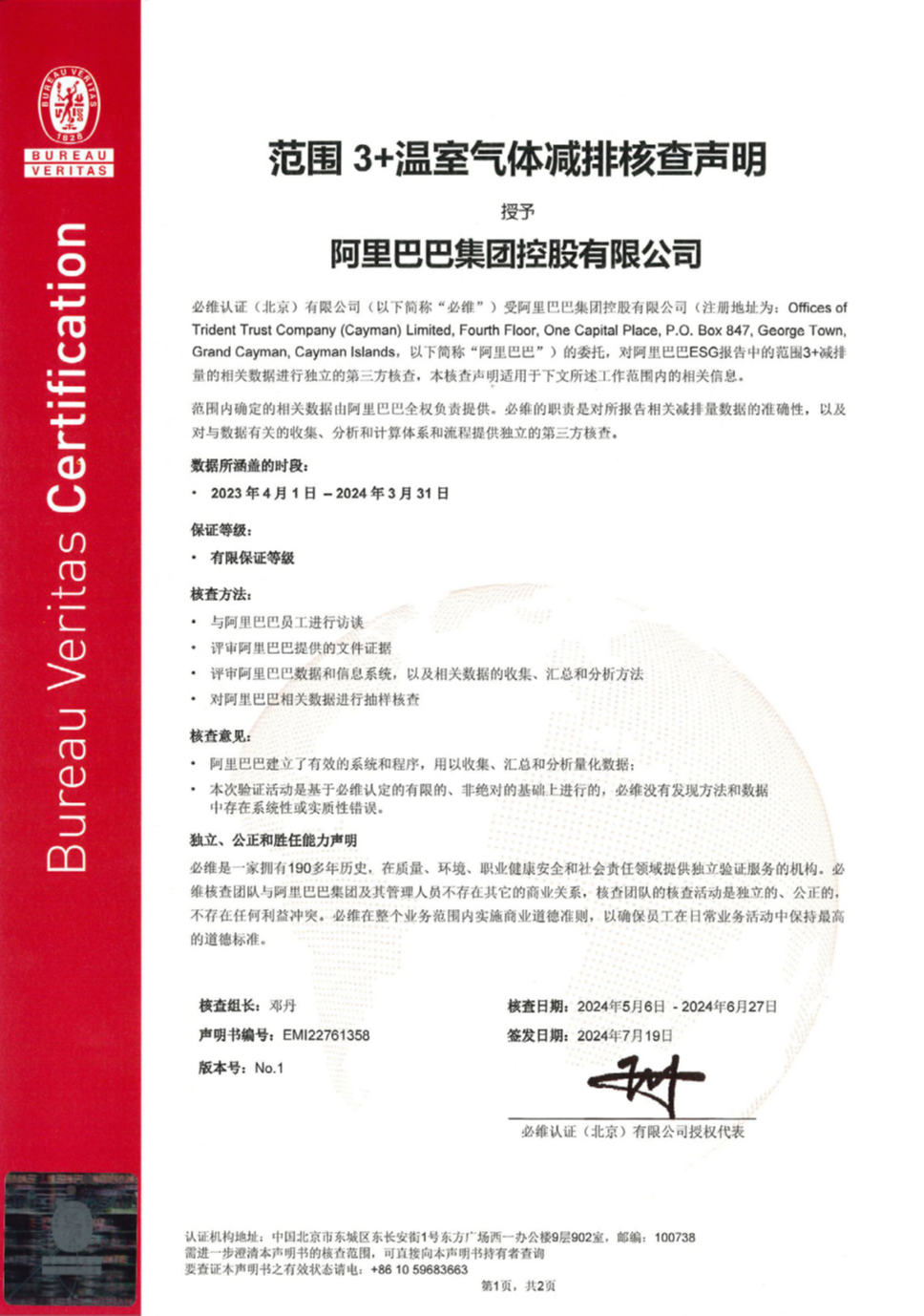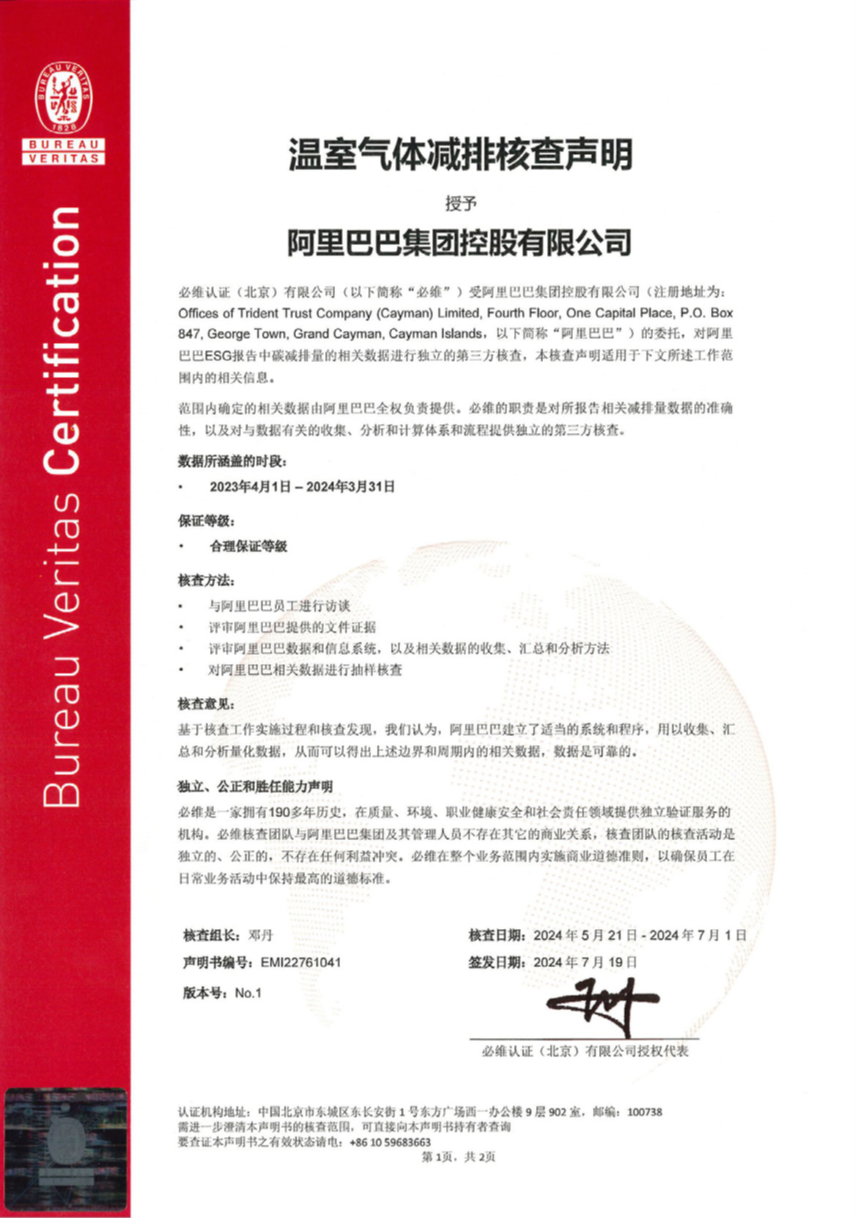 2024财年是阿里巴巴深化ESG治理的一年。此次,必维为阿里巴巴提供了包括ESG报告中相关环境数据的独立第三方核查、温室气体减排核查、以及范围3+温室气体减排核查服务,见证阿里巴巴以ESG治理机制的保障为基础,继续探索“在发展中减碳”,推进绿色低碳高质量发展。