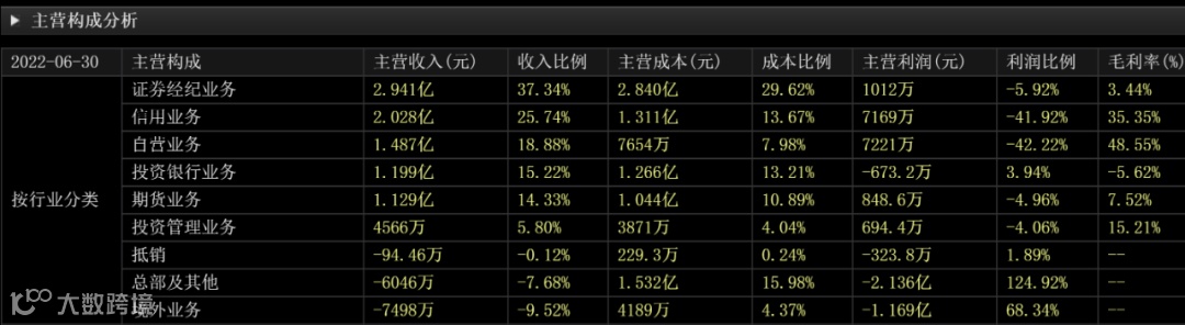 看了中金和中信这两个大券商,我们再看小券商的代表。比如中原证券(601375.SH),证券经纪业务是公司第一大营收来源,占主营收入的37.34%,明显比中信证券的23.72%要高很多。