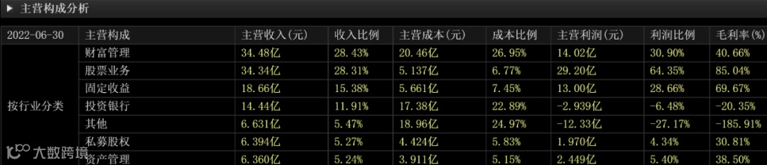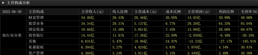 我们以金字塔尖的、人均年薪近百万的中金公司(601995.SH)来说,在它的主营构成表中,我们看不到证券经纪业务,而是财富管理、股票业务、固定收益、投资银行、私募股权、资产管理这些业务。