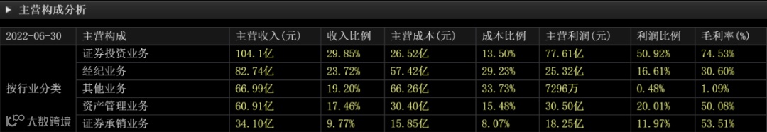 我们再看券商一哥中信证券(600030.SH)的主营构成表,其证券经纪业务占营收比例为23.72%,并不是排在第一位的。