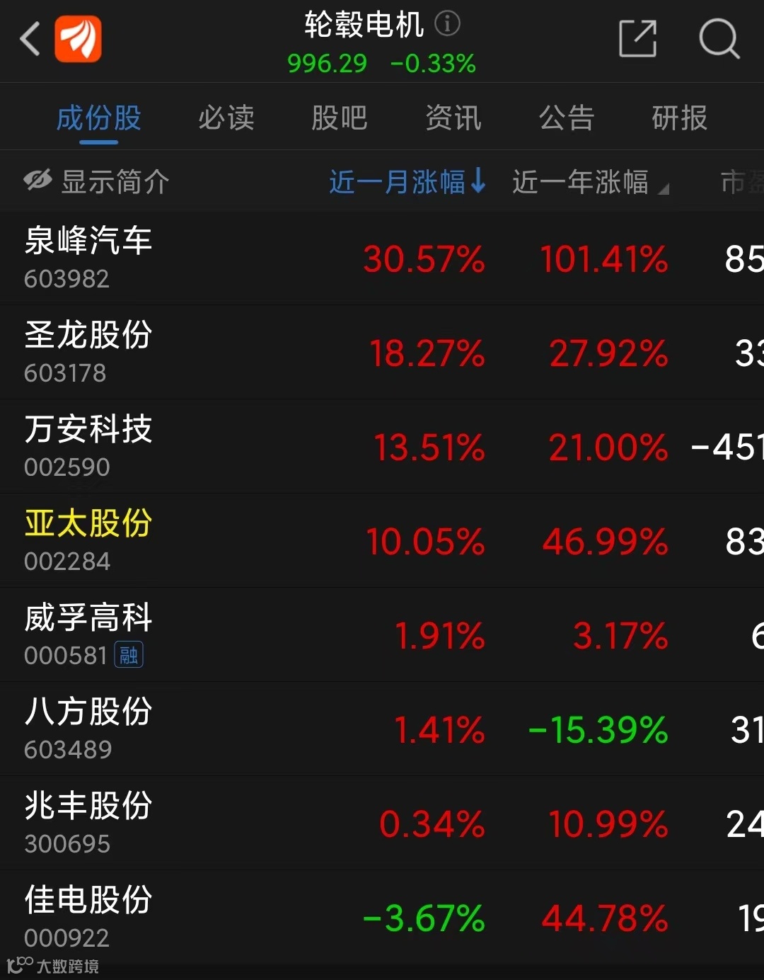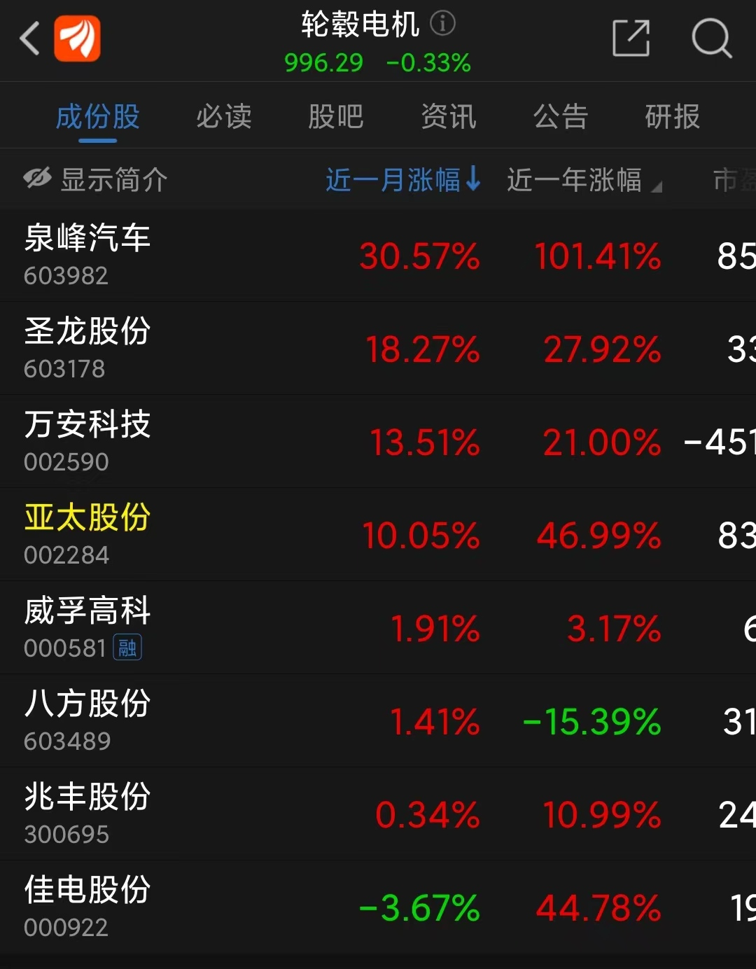 近一个月以来,泉峰汽车股价涨超30%,近一年已经翻倍。圣龙股份、万安科技、亚太股份近一个月涨超10%。