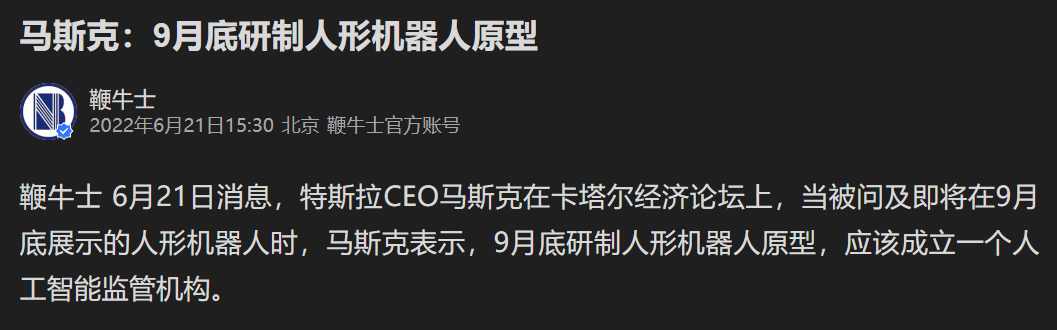 6月底,“钢铁侠”马斯克在接受媒体采访时突然曝出,特斯拉“人形机器人‘TeslaBot-Optimus(擎天柱)’将在9月30日的特斯拉AI日活动上面世”,并称将于2023年投入生产,目标是为了代替部分危险、重复性劳动以及填补劳动力缺口。