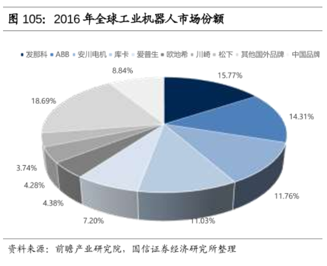 虽然国内的新松机器人与ABB、安川、FANUC、KUKA齐名,但其实新松是这几家机器人中最弱的,弱在精度、弱在市场。数据显示,截至2016年FANUC、ABB、安川、KUKA、爱普生、欧地希、川崎、松下等国外品牌就占了全球工业机器人市场91.16%的份额,国产品牌仅占8.84%的份额。