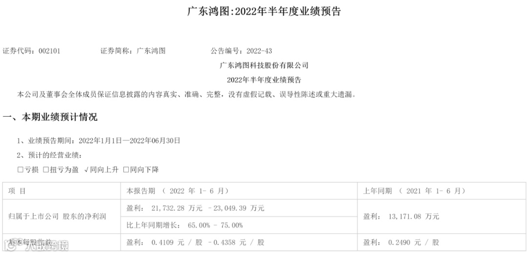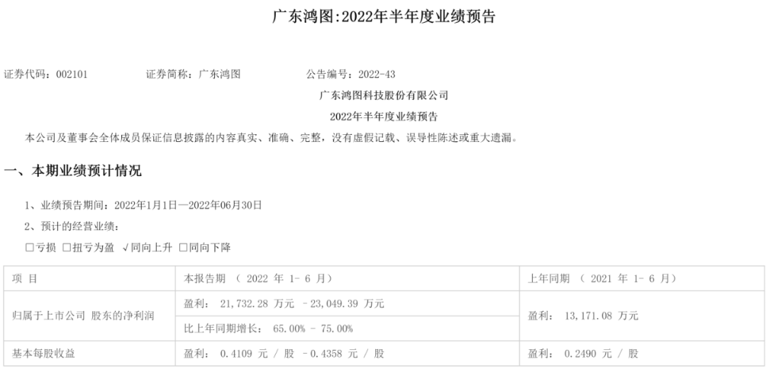 7月15日,广东鸿图发布2022年上半年业绩预告,预计净利润同比增长65%-75%。