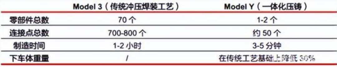 以特斯拉为例,一体化压铸技术将给特斯拉的大热车型Model Y降低20%的制造成本。一体化压铸机每天能生产1000个铸件,完爆传统冲压焊接工艺。一体压铸的车身只需一个零部件,焊接点将从700-800个大幅缩减为只有50个。