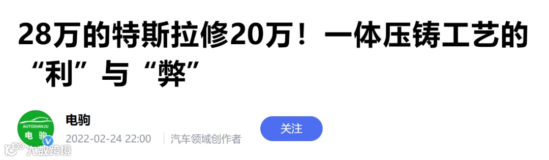 要说一体化压铸技术有什么缺点,恐怕就是维修成本太高。一辆特斯拉Model Y车主出现事故之后,由于后部车身是用一体化压铸的,因此28万买的车需要高达20万的修理费!