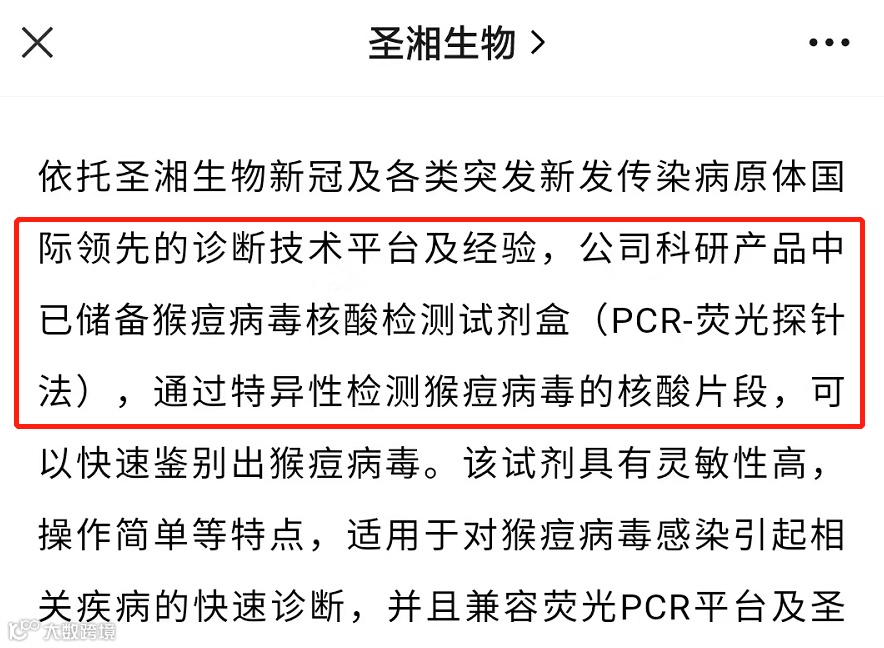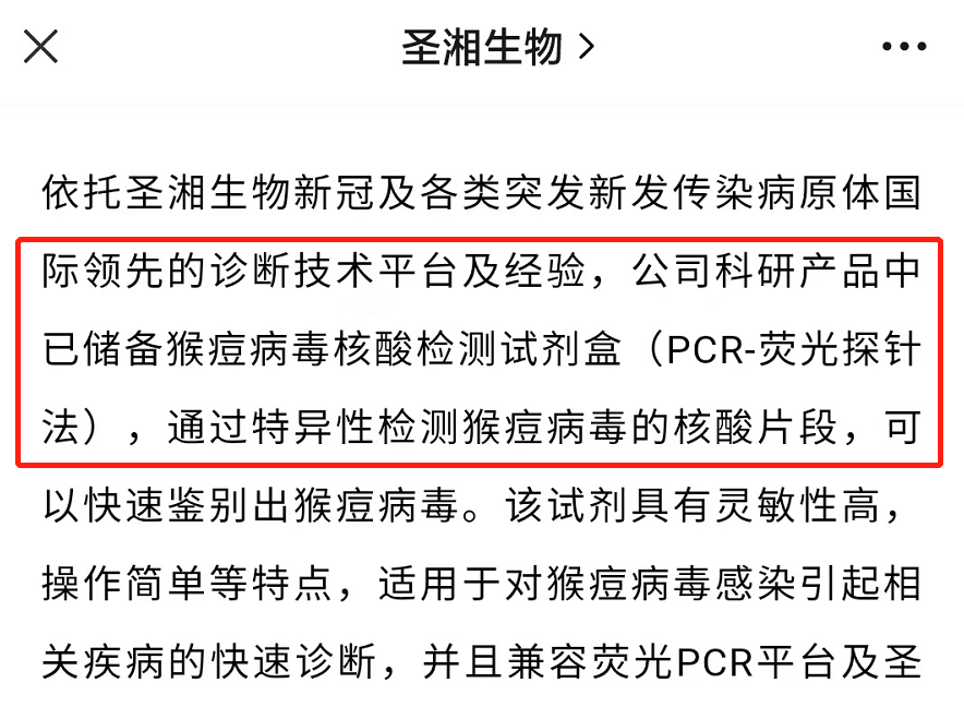 5月22日,圣湘生物在其官方公众号表示,公司科研产品中已储备猴痘病毒核酸检测试剂盒(PCR-荧光探针法),可以快速鉴别出猴痘病毒。