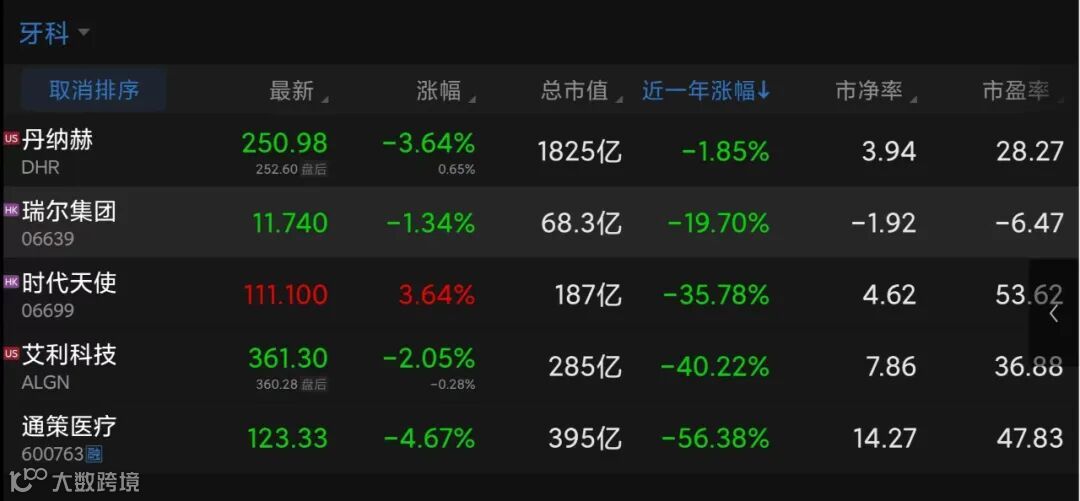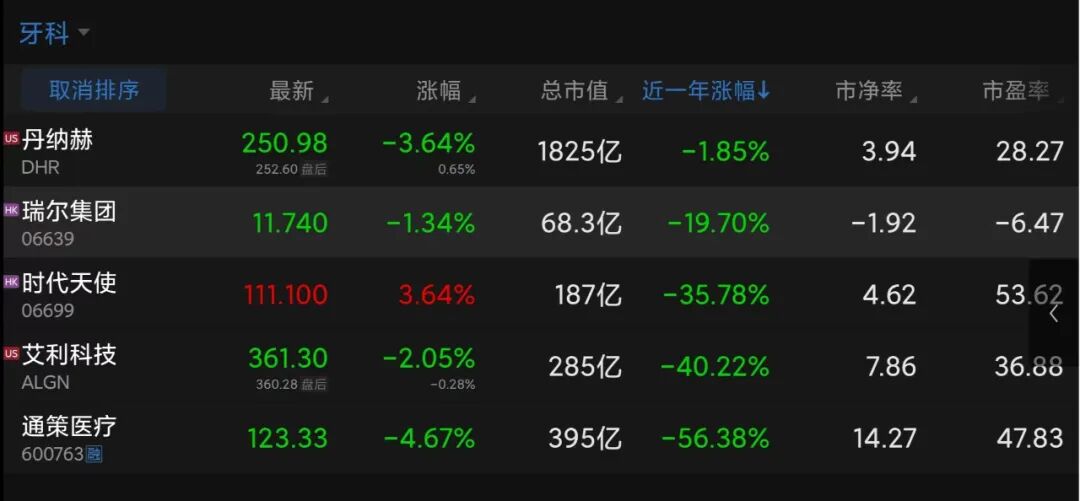 单看A股的牙科,可能会觉得通策医疗太惨了,但实际上过去一年是全球整个牙科上市公司股价的大调整时期,不仅通策医疗在跌,美股、港股、A股的牙科上市公司股价都在跌!