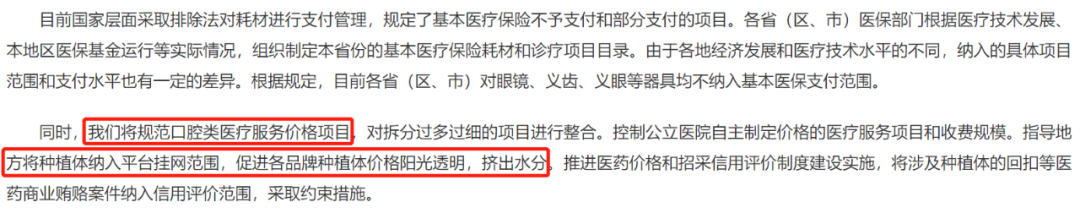 原因还是与集采有关。去年9月22日国家医保局的一篇发文明确指出,将规范口腔类医疗服务价格项目,对拆分过多过细的项目进行整合,指导地方将种植体纳入平台挂网范围。