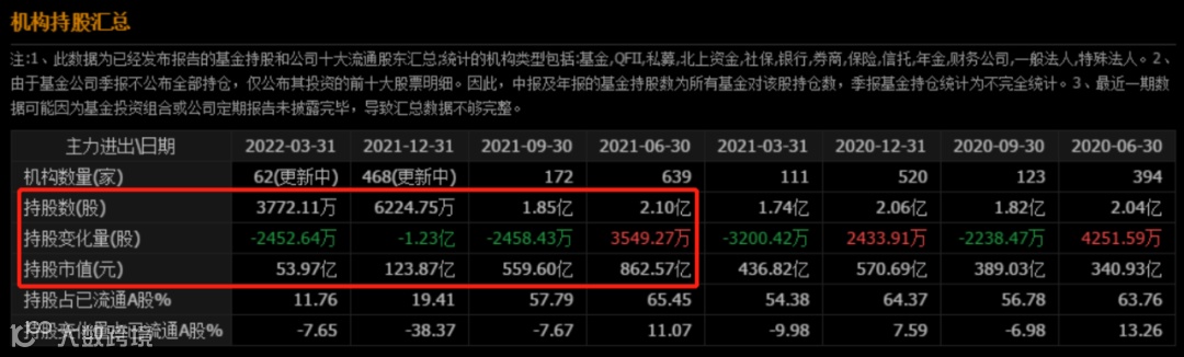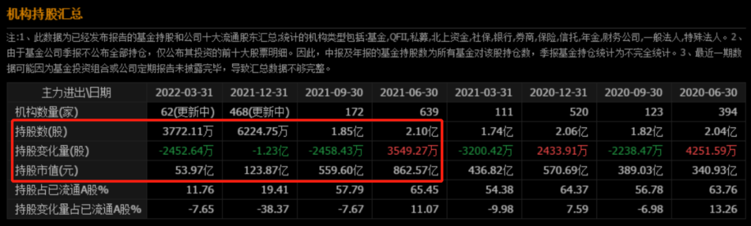 据通达信股东数据显示,自去年三季度开始公司机构持股数量就持续下降,从2021年二季度的2.1亿股,降至今年一季度的3772.11万股,而这个变化与公司股价的变化正好吻合。