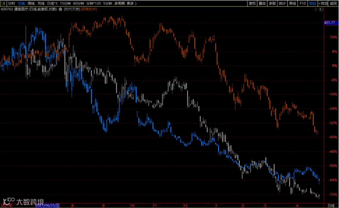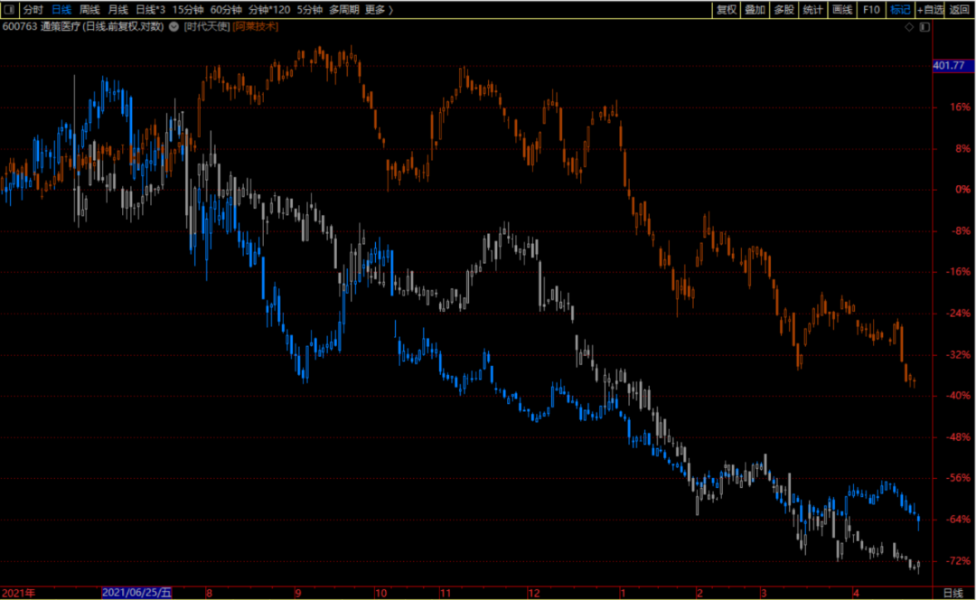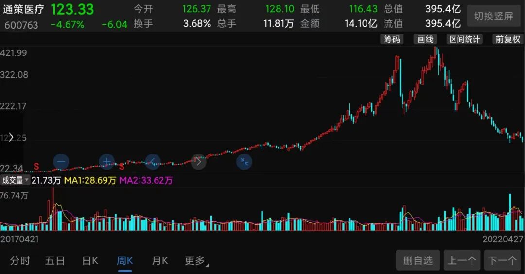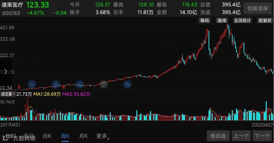 即使在这样大涨的氛围下,已经较高位暴跌超70%的“牙茅”通策医疗(600763.sh)还是大跌收盘。