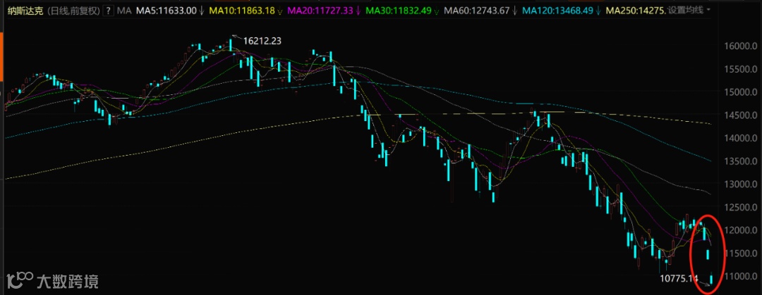 目前纳斯达克指数已经从16000点以上的历史高位,跌到了当前的11000点以下,在半年多一点的时间里,下跌空间超过了5000点,下跌幅度整整三分之一。