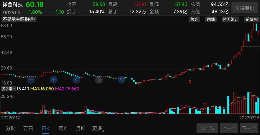4月底以来,祥鑫科技的股价从最低16.88元一路涨到最高68.09元,3个月暴涨3倍多,公司市值从不到30亿飙涨到现在的95亿左右,最近两周更是走出了7天4板的行情。