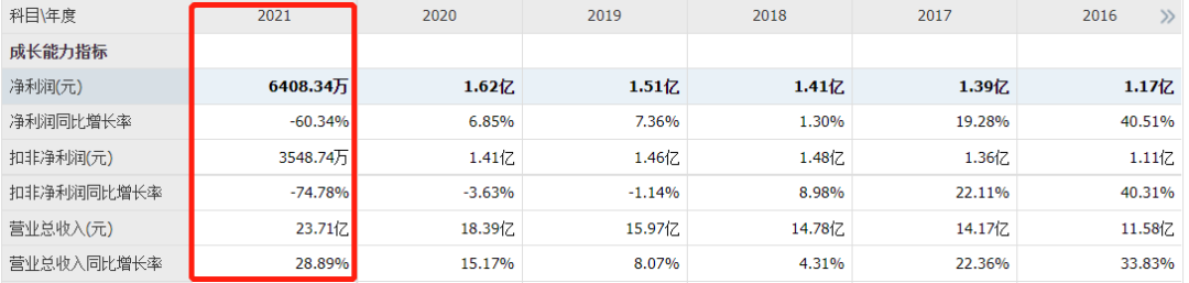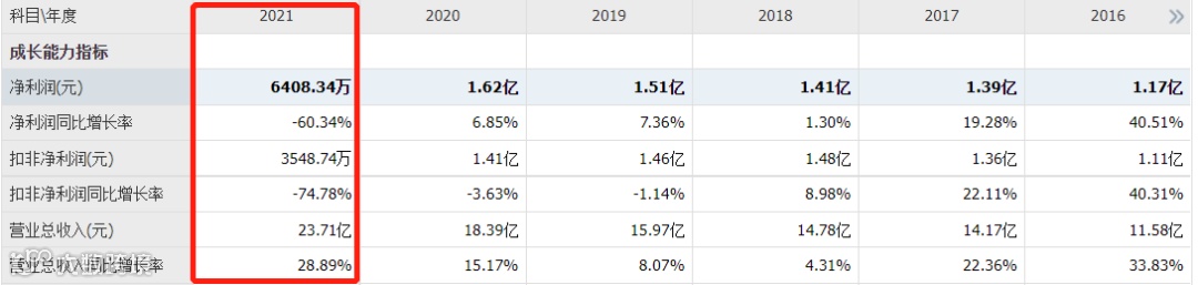 上市之后,2020年4月发布的首发年报也显示,2019年实现净利润1.51亿,2020年也实现了1.62亿的净利润,但2021年却突然暴跌超60%仅实现6508.34万的净利润。