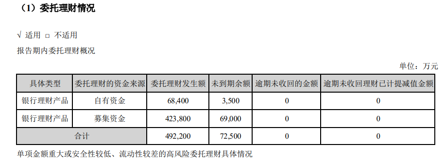2019年10月上市时祥鑫科技IPO募资13.86亿,资金到手以后公司立马将募资的大部分拿去买理财产品,2019年期末持有交易性金融资产5.9亿,2020年末持有5.06亿,2021年一季度末一度持有9.69亿,到今年一季度末仍持有6.1亿交易性金融资产。
