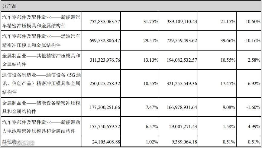 从公司产品结构看,祥鑫科技产品横跨汽车、光伏、储能、通信四大领域,且都是当下A股热门赛道。2021年祥鑫科技营收23.71亿,其中新能源汽车零部件收入7.53亿、燃油车零部件收入7亿、冲压模具收入3.11亿、通信设备模具收入2.5亿、储能模具收入1.77亿、动力电池模具收入1.55亿。