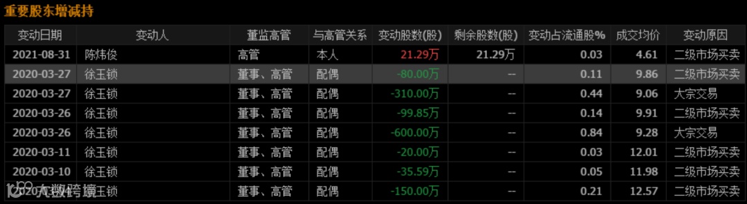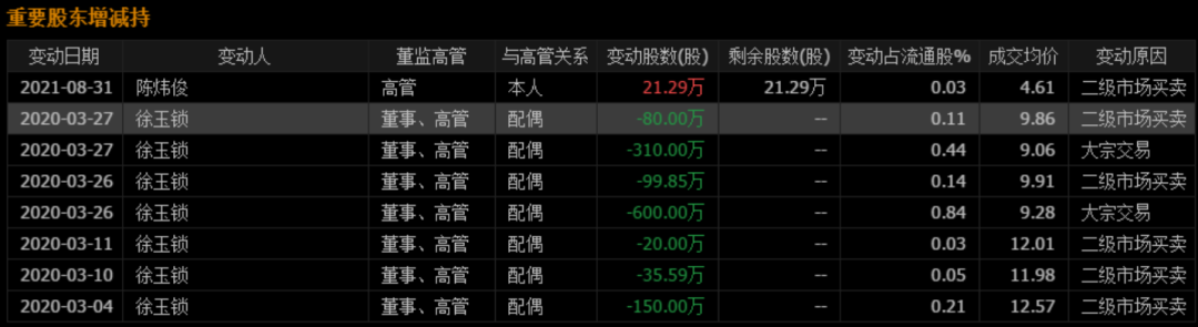 按时间算,2017年初对徐玉锁的5年市场禁入措施在今年年初届满,但数据显示,在2020年徐玉锁曾多次通过二级市场、大宗交易方式频繁、巨额减持公司股份。
