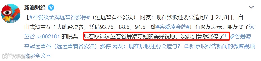 远望谷涨停的神逻辑就是,有人买了远望谷的股票,想着取远远望着谷爱凌夺冠的美好祝愿,没想到竟然涨停了!