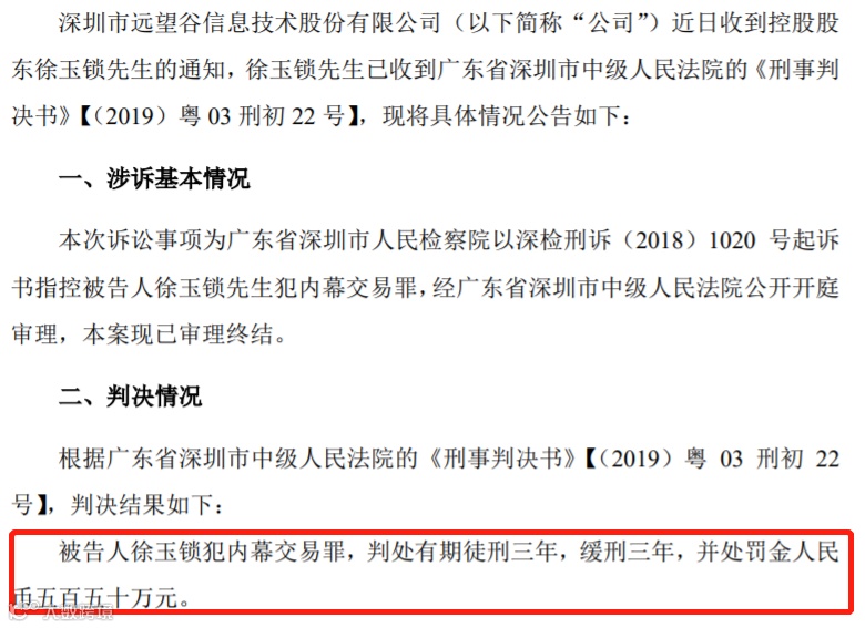 2019年7月6日远望谷发布公告称,控股股东徐玉锁犯内幕交易罪,判处有期徒刑三年,缓刑三年,并处罚金人民币五百五十万元。