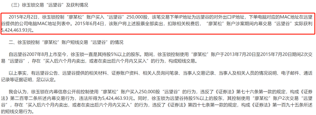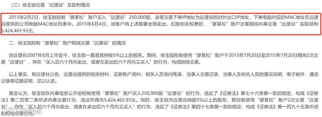 2017年1月9日证监会发布的一份行政处罚决定书和一份市场禁入决定书显示,远望谷创始人、实控人徐玉锁,在2015年2月-6月期间利用内幕信息买卖远望谷股票获利542.44万,对徐玉锁内幕交易行为没收违法所得542.44万,并处以1627.34万罚款,并对其采取5年市场禁入措施。