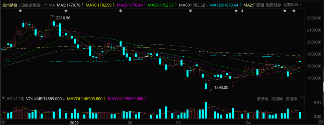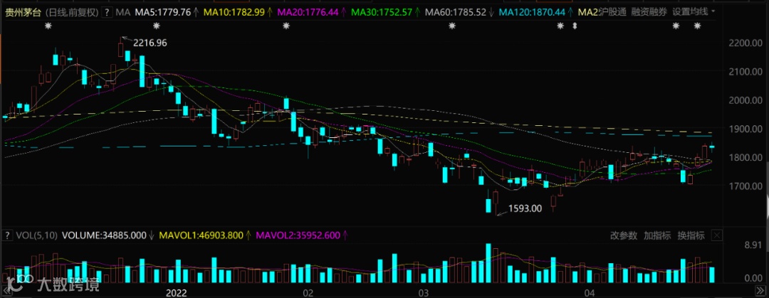 把利好业绩抢先发布之后,整个4月份贵州茅台在大盘向下的环境下,表现得十分抗跌,股价一直围绕1800元上下小幅震荡。