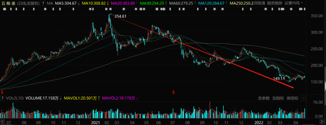 从2021年年初的高点到今年的低点,五粮液股价已经下跌超过55%,不可谓不惨烈。