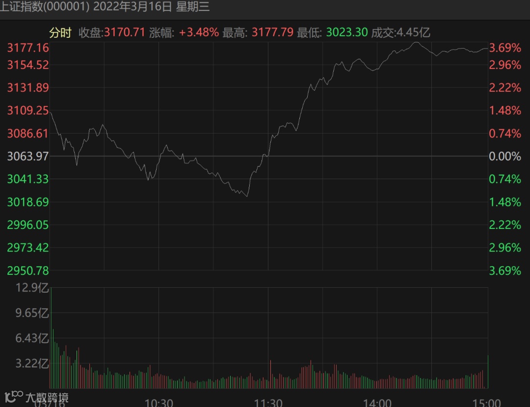 在经历了连续大幅下跌之后,受相关会议的利好刺激,3月16日,眼看就要跌破3000点大关的A股完成绝地反击,在盘中急跌之后出现大幅拉升。