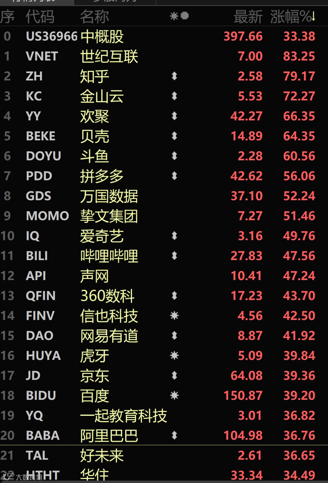3月16日的恒生科技指数大涨22.2%,大量科技股的涨幅都在30%以上,当晚的中概股指数也大涨超过30%,知乎、金山云、拼多多、贝壳这些知名中概股的涨幅更是高达50%以上。