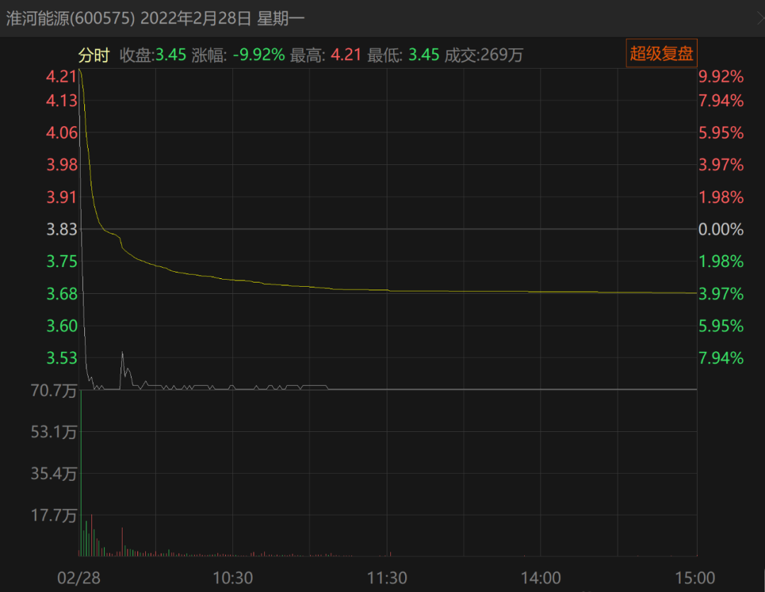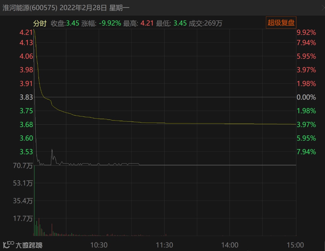 3月1日,淮河能源又是大幅低开,并在盘中一度跌停,截至收盘大跌6.09%。
