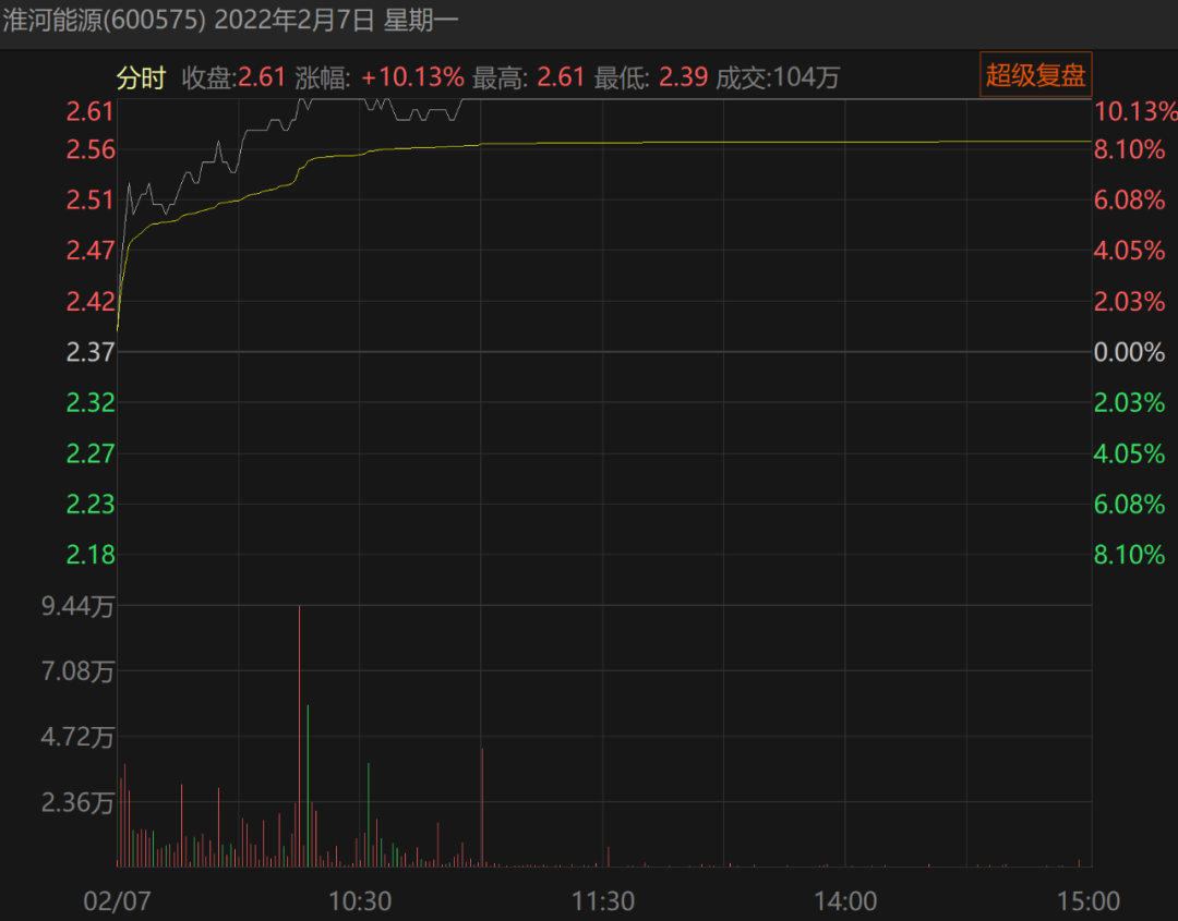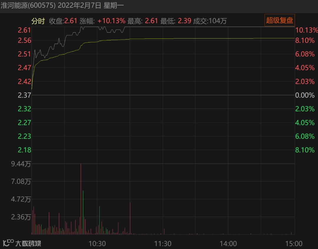 长期以来,淮河能源走势平平,但在2月7日,也就是春节后第一个交易日,淮河能源早盘就直线冲高,并在上午封死涨停板。