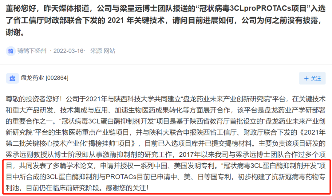 从公司的回复来看,盘龙药业似乎确实拥有冠状病毒3cl蛋白酶相关的专利技术,但相关药物目前还处于临床前的研究阶段!