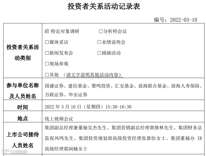 据公司发布的投资者关系活动记录表显示,本月以来,3月2日通过网上路演回答投资者提问,3月8日接待天风证券、国融证券、凯丰投资、光证资管等12家特定调研对象,3月10日又接待了国盛证券、建信基金、聚名投资、前海人寿、华安证券、万联证券等8家特定调研对象。