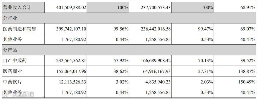 2021年上半年公司总营收4.01亿,其中自产中成药2.32亿、占比57.92%,医药商业收入1.55亿、占比38.62%,中药饮片收入1211.35万、占比3.02%,其他业务收入176.71万、占比0.44%。可以看出,盘龙药业的主要产品是中成药及中药饮片。